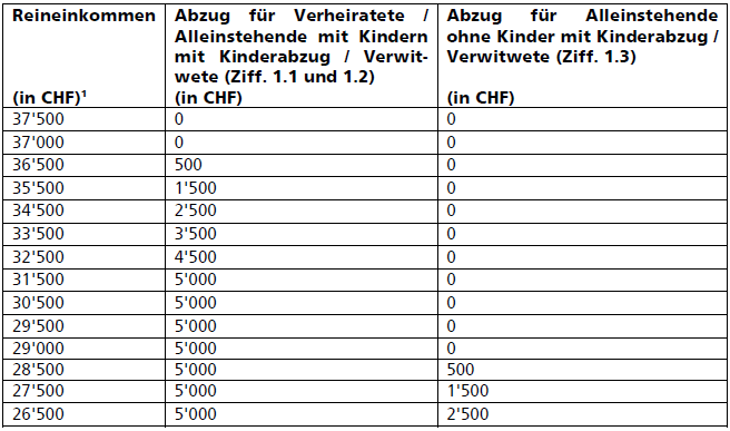 Für verheiratete Steuerpflichtige sowie verwitwete, getrennt lebende, geschiedene und ledige Steuerpflichtige, die mit Kindern zusammenleben gilt ein Reineinkommen unter CHF 38’200 als ungenügend. Sie können, sofern ihr Reineinkommen CHF 33’200 nicht übersteigt, den Höchstabzug von CHF 5’000 beanspruchen. Der Abzug vermindert sich um je einen Franken pro Franken zusätzlichen Reineinkommens und entfällt bei einem Reineinkommen von CHF 38’200 ganz.