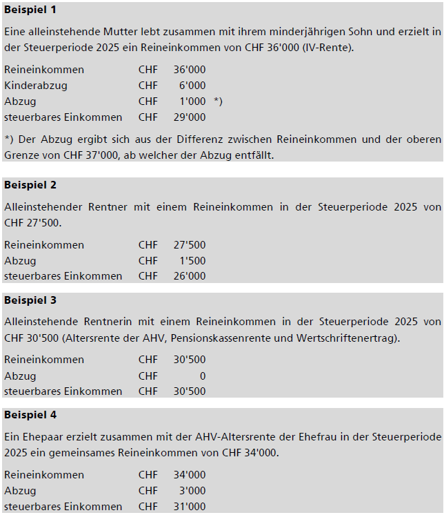 Für alleinstehende Steuerpflichtige gilt ein Reineinkommen unter CHF 29’000 als ungenügend. Dies gilt auch für die länger Verwitweten, die nicht mit Kindern zusammenleben. Diese Personen können, sofern ihr Reineinkommen CHF 25’000 nicht übersteigt, den Höchstabzug von CHF 5’000 beanspruchen. Der Abzug vermindert sich um je einen Franken pro Franken zusätzlichen Reineinkommens und entfällt bei einem Reineinkommen von CHF 30’000 ganz.